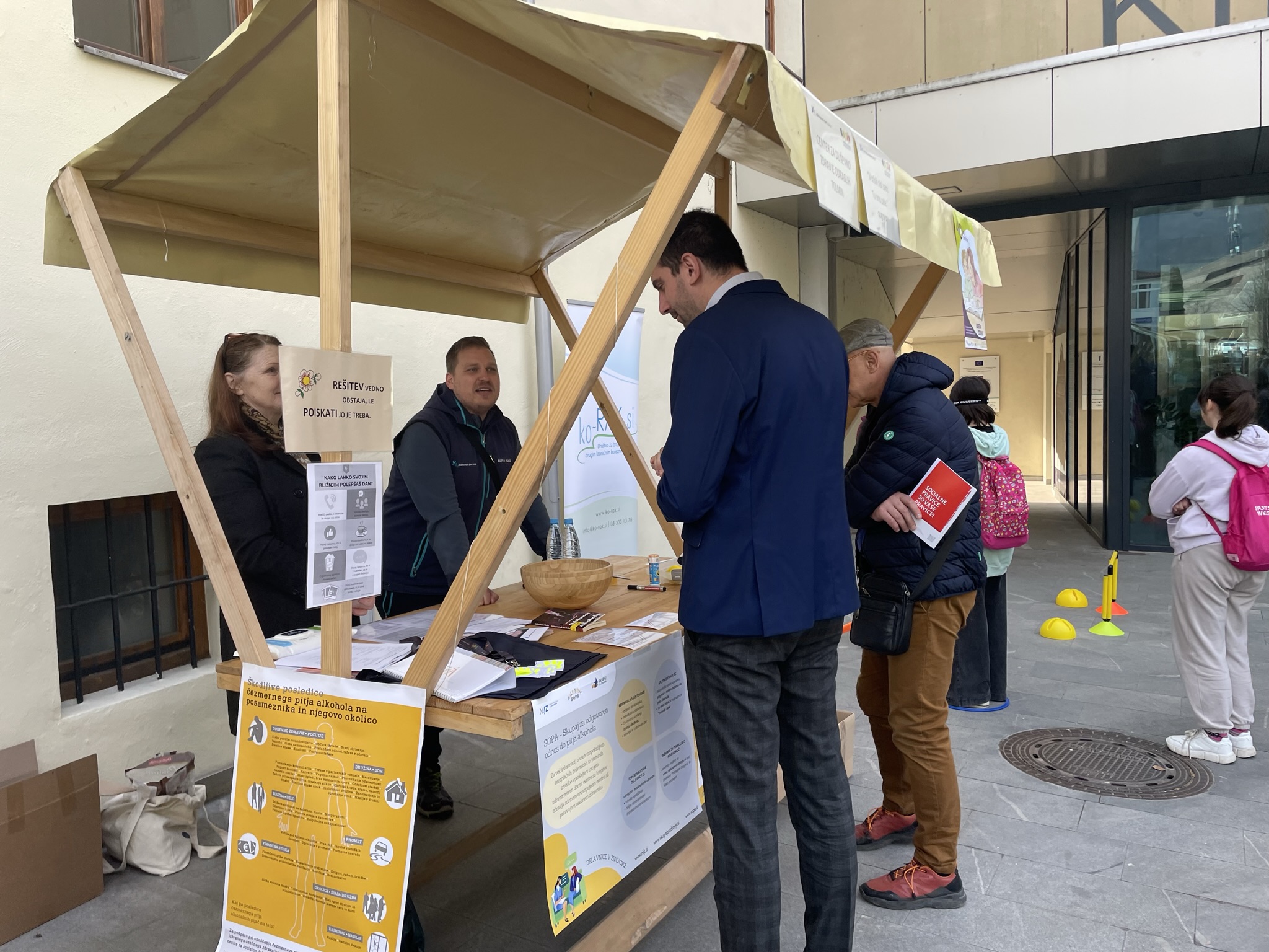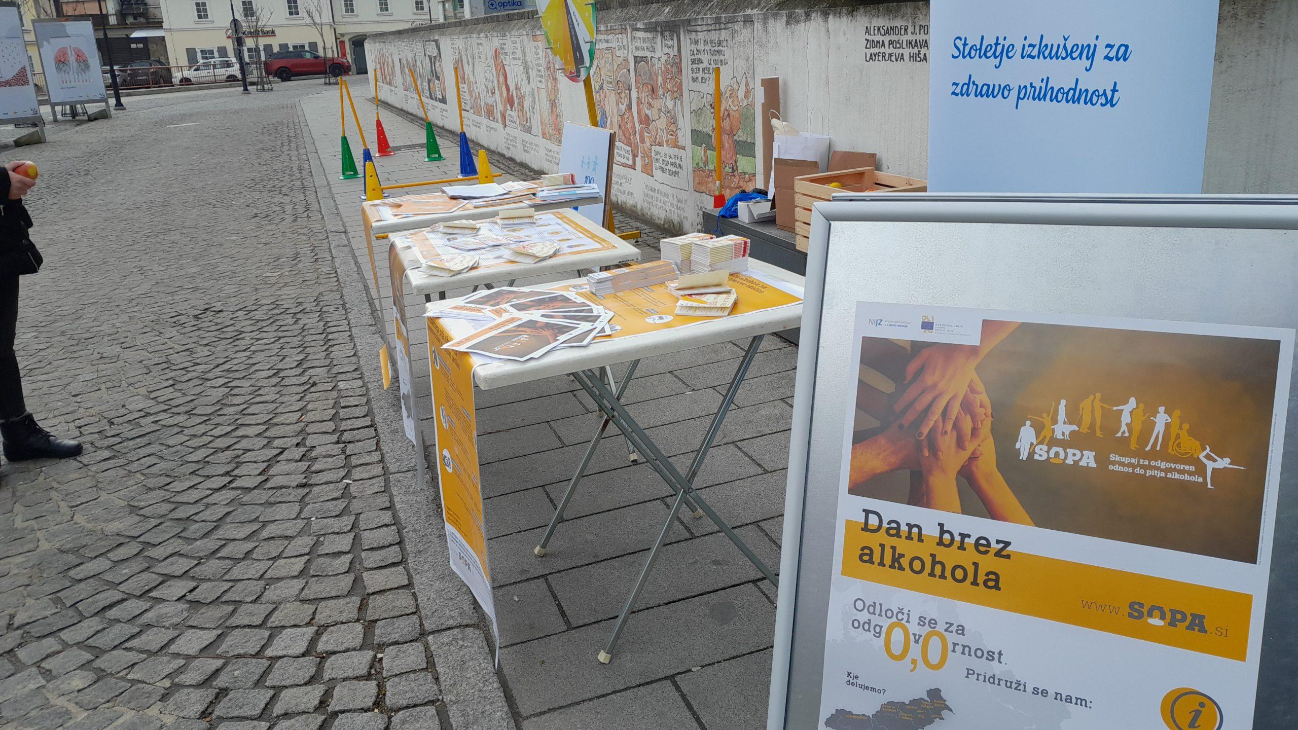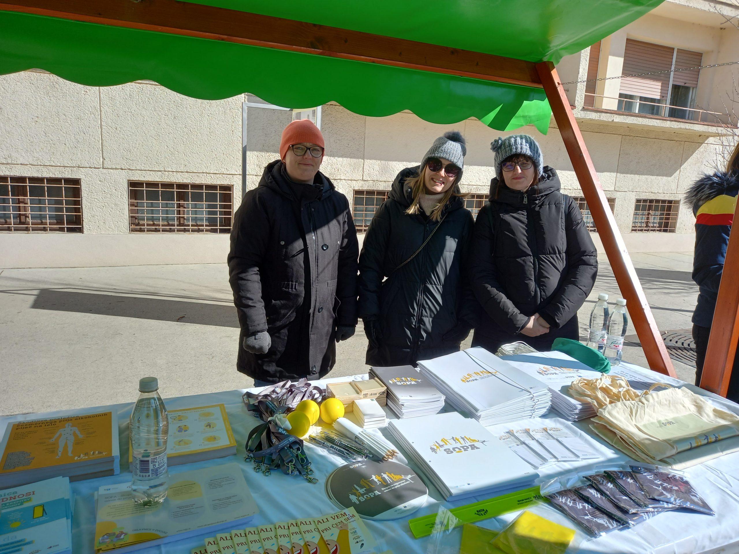 V petek, 24. marca 2023, je na Mestnem trgu v Tolminu potekal dogodek »Dan brez alkohola«, ki sta ga na NIJZ OE Nova Gorica organizirali Irena Jerič in Ana Peršič s pomočjo Zdravstveno vzgojnega centra Zdravstveni dom Tolmin in Občino Tolmin. »Dan brez alkohola« smo začeli obeleževati pred petimi leti v okviru projekta SOPA – Skupaj za odgovoren odnos do pitja alkohola, saj želimo javnosti približati naša prizadevanja na tem področju.