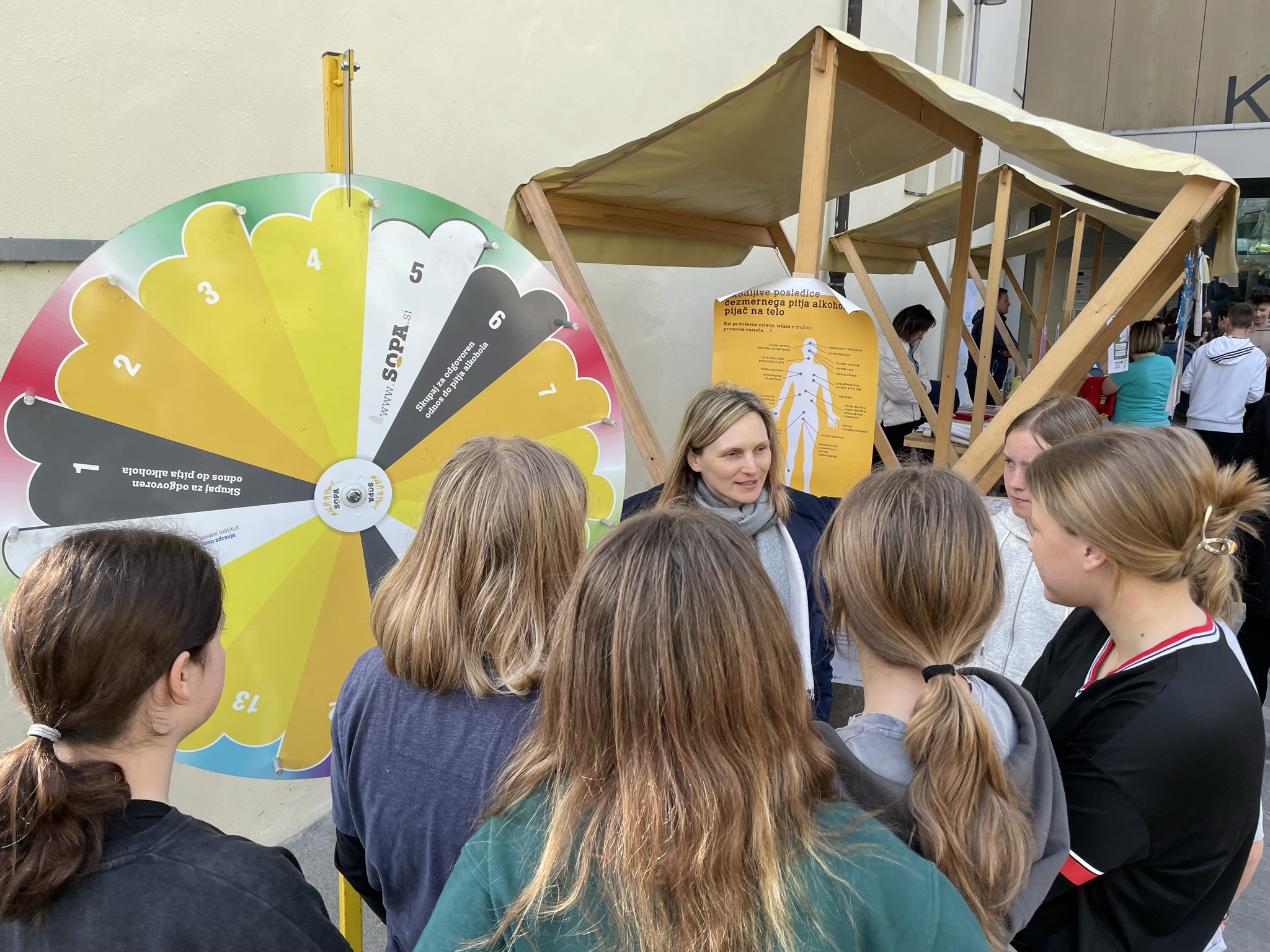 Na dogodku smo se pogovarjali o zdravih življenjskih izbirah v našem vsakdanu in predstavili vire pomoči in možnosti podpore pri opuščanju nezdravega življenjskega sloga. Obiskovalci so lahko s pomočjo očal, ki simulirajo različne stopnje opitosti, izkusili, kako alkohol negativno vpliva na naše motorične sposobnosti, policist pa jim je podrobneje predstavil tveganja, ki jih alkohol predstavlja v prometu. Vsako leto ugotavljamo tudi, da so obiskovalci presenečeni nad statistikami glede pitja alkohola v Sloveniji, prav tako nad miti, ki jih razbijamo preko sproščene igre »kolo sreče« na temo alkoholne problematike. Med miti, ki jih ovržemo je tudi ta, da je alkohol dober za kri.