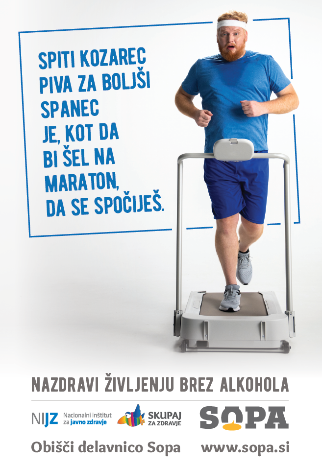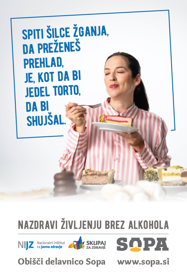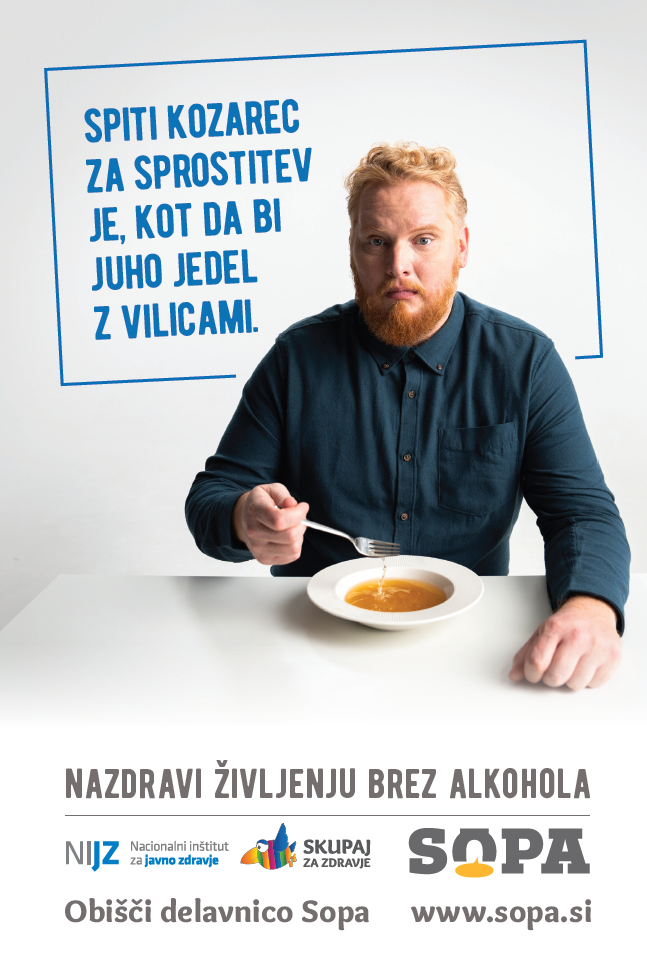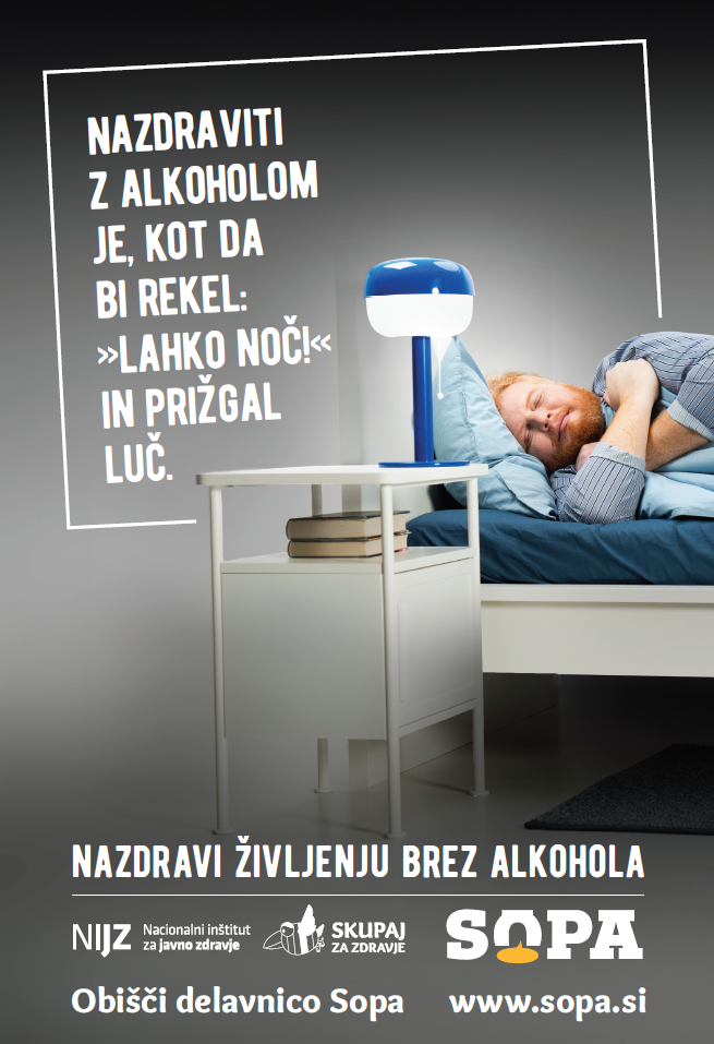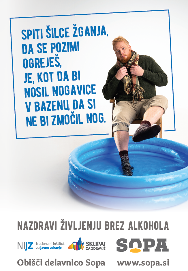 Plakati kampanje Nazdravi življenju brez alkohola, A3 verzije (kako se sprostiti brez alkohola, kako se ogreti brez alkohola, kako zaspati brez alkohola, kako nazdraviti brez alkohola, kako preboleti prehlad, kako se v nosečnosti sprostiti brez alkohola)