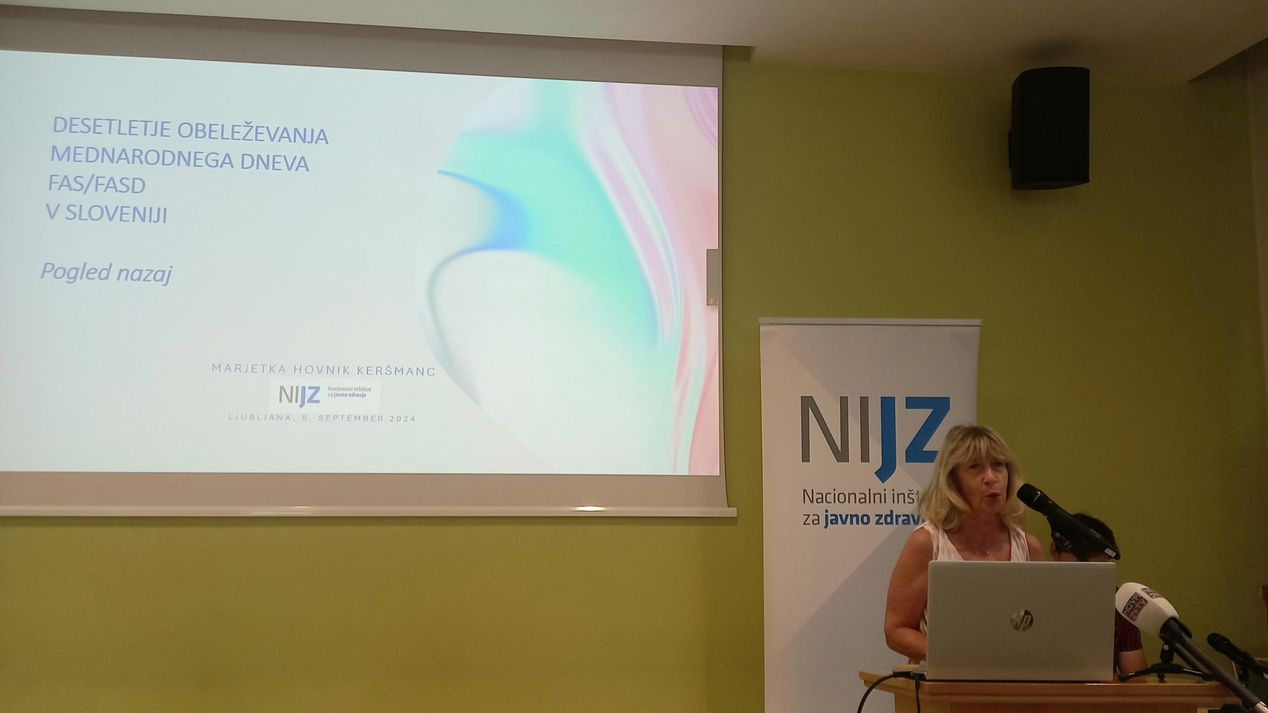 Sklop plenarnih predavanj je otvorila mag. Marjetka Hovnik Keršmanc z NIJZ, pobudnica in strokovna vodja obeleževanja mednarodnega dne ozaveščanja o FASD v Sloveniji. V svoji predstavitvi nas je popeljala skozi desetletje aktivnosti, med katerimi velja izpostaviti vrsto ključnih strokovnih srečanj ter pripravo in diseminacijo zloženk, plakatov, avdio-vizualnih vsebin in ozaveščevalnih medijskih izjav za javnosti. »Izpostavljenost alkoholu med nosečnostjo poveča tveganje za splav, mrtvorojenost, prezgodnje rojstvo, nizko porodno težo, nenadno smrt dojenčka, je pa tudi edini vzrok za spekter fetalnih alkoholnih motenj (FASD). Alkoholu izpostavljene nosečnosti so preprečljiv javnozdravstveni problem.« Po predstavitvi je mag. Hovnik Keršmanc za dolgoletna prizadevanja in učinkovitost delovanja na področju raziskovanja in ozaveščanja o FASD prejela posebne čestitke in zahvalo.