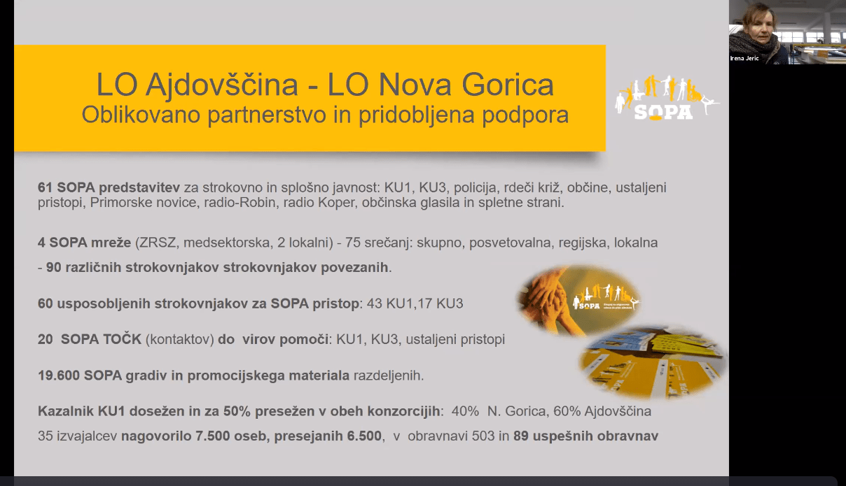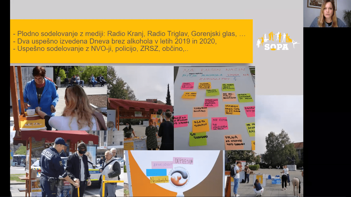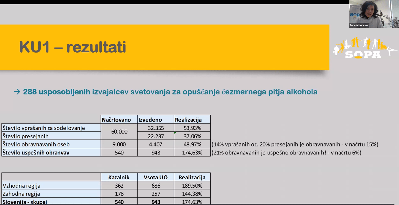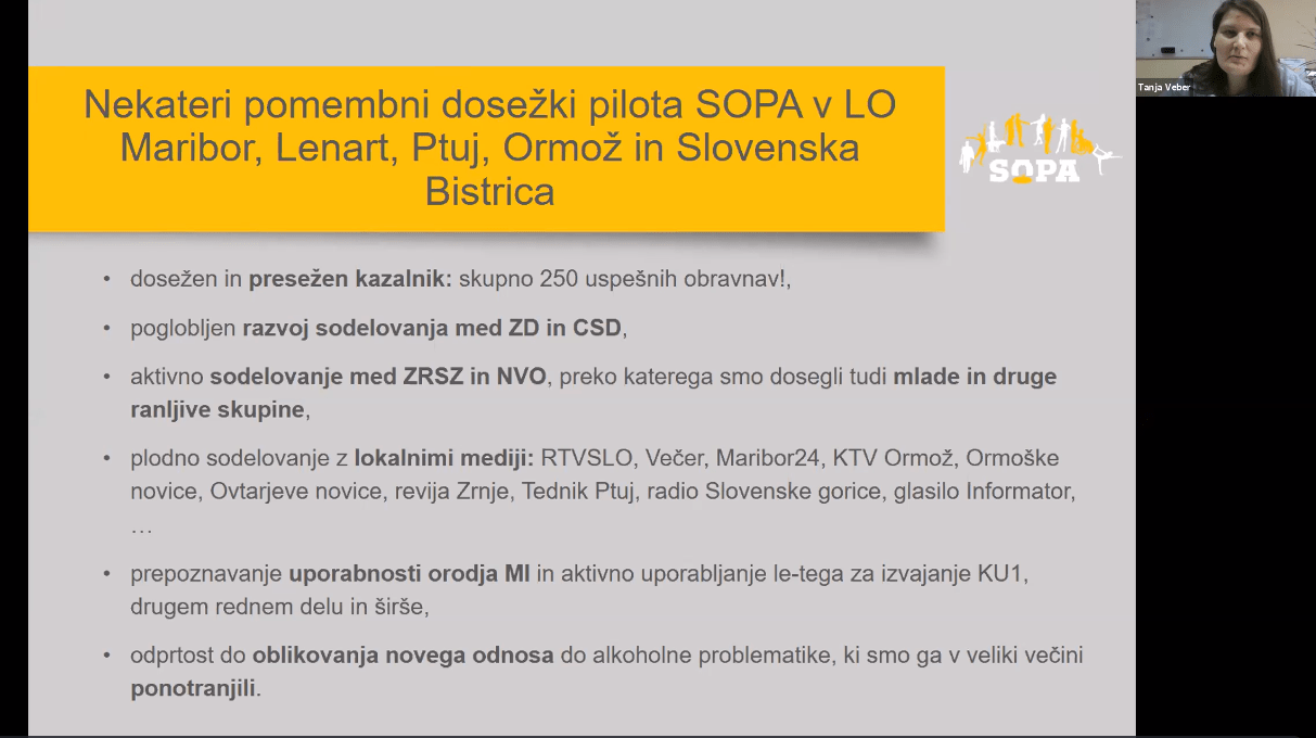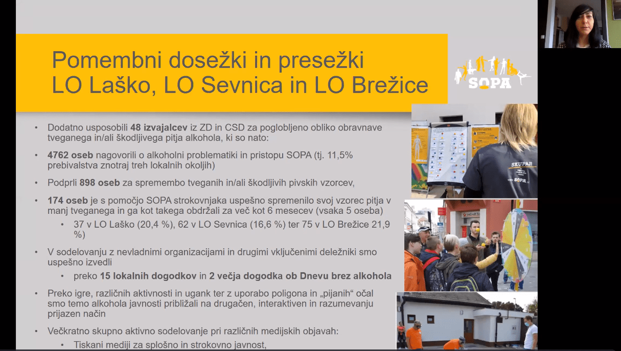 Na zaključnem spletnem srečanju izvajalcev pristopa SOPA se je zbralo preko 350 strokovnjakov iz zdravstvenega, socialnega, nevladnega sektorja in Zavoda RS za zaposlovanje, skupaj s predstavniki občin in policije, ki prihajajo iz 18 različnih lokalnih okolij po Sloveniji. Predstavili smo jim končne rezultate na terenu tako na nacionalni kot regijski ravni, ki smo jih dosegli s skupnimi prizadevanji in sodelovanjem. Med drugim smo tekom projekta v 4 letih izvedli preko 160 posvetovalnih srečanj za strokovnjake o zamejevanju alkoholne problematike, ob 300 usposobljenih strokovnjakih s primarne zdravstvene ravni in centrov za socialno delo smo za izvajanje svetovanja za opuščanje čezmernega pitja alkohola usposobili tudi 138 zdravstvenih delavcev s področij drugih specialnosti: kardiologija, ginekologija, gastroenterologija, onkologija in otorinolarigologija ter urgentna, transfuzijska in dentalna medicina.