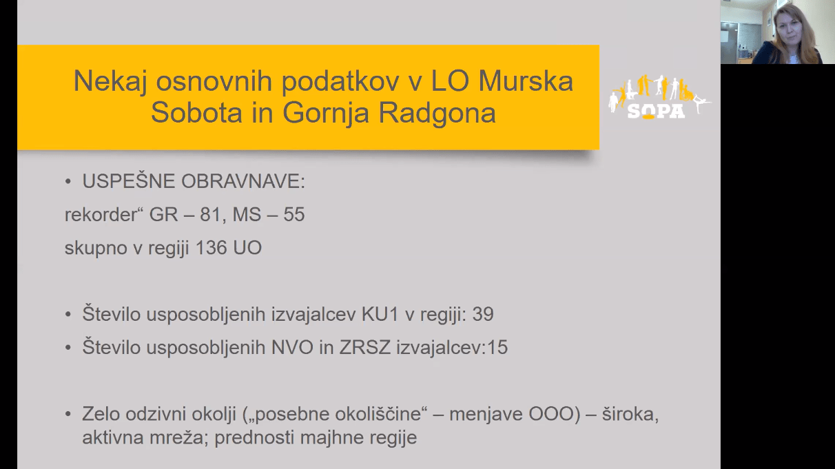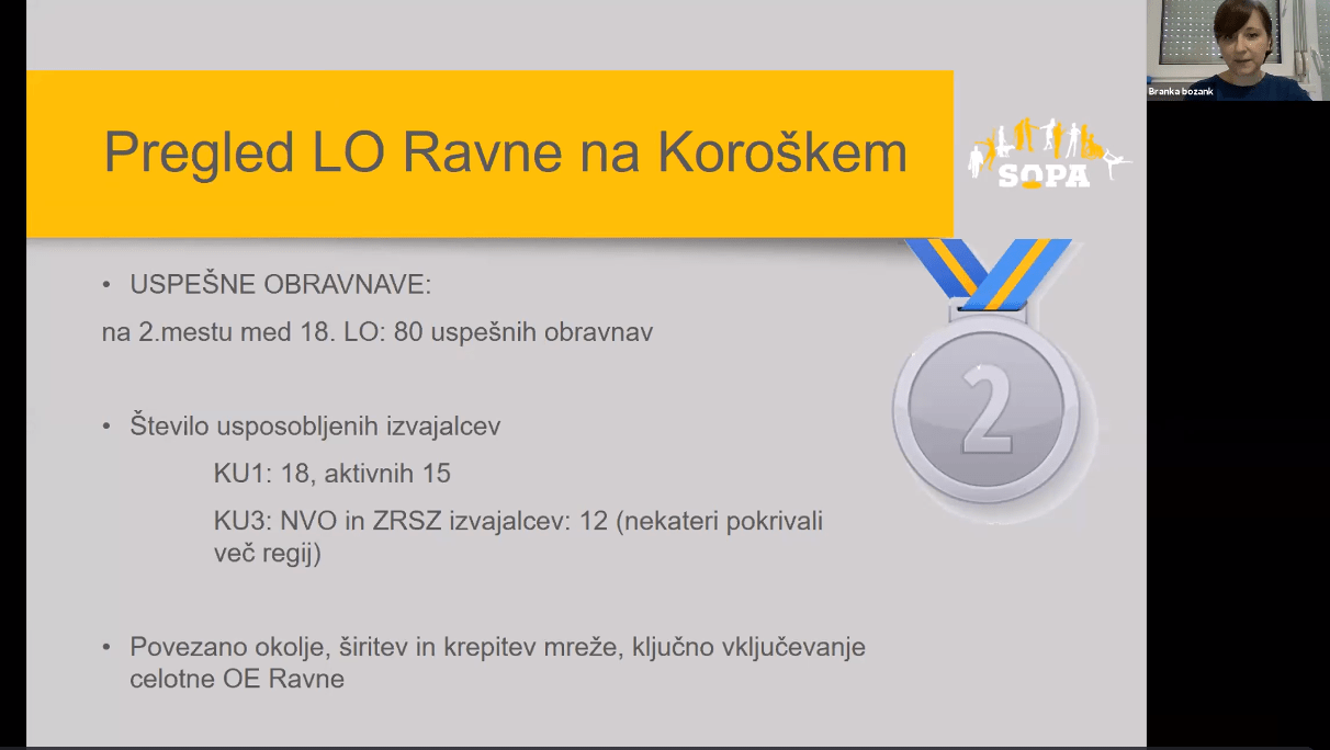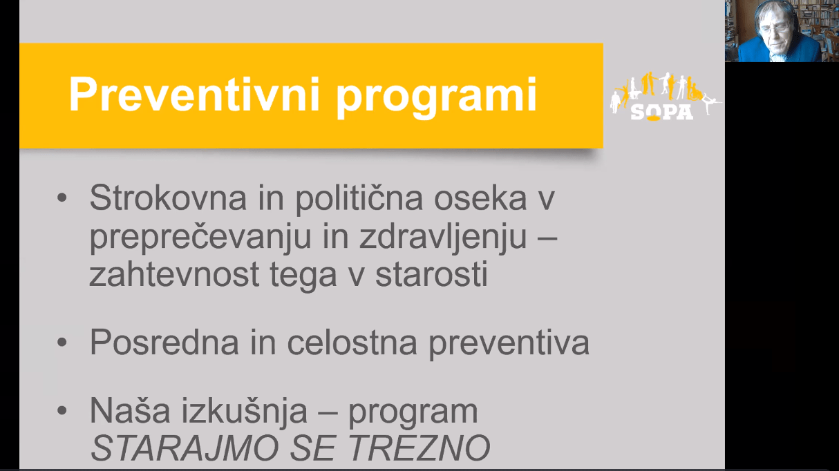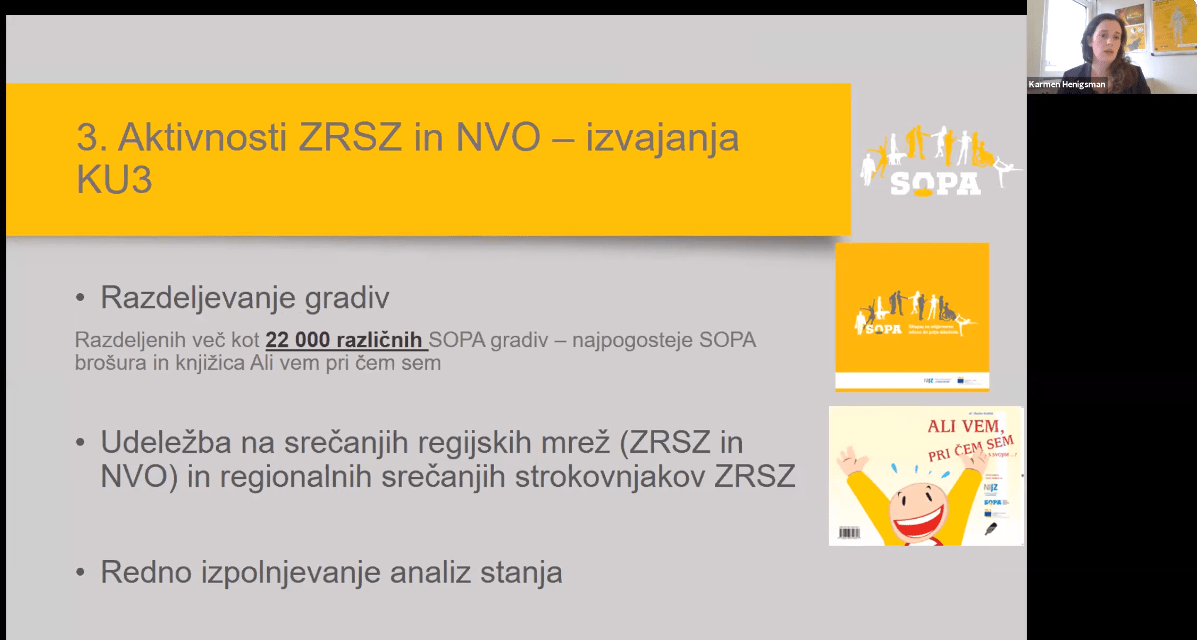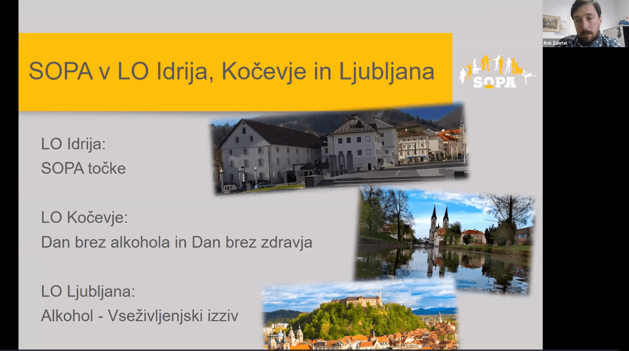 Na zaključnem spletnem srečanju izvajalcev pristopa SOPA se je zbralo preko 350 strokovnjakov iz zdravstvenega, socialnega, nevladnega sektorja in Zavoda RS za zaposlovanje, skupaj s predstavniki občin in policije, ki prihajajo iz 18 različnih lokalnih okolij po Sloveniji. Predstavili smo jim končne rezultate na terenu tako na nacionalni kot regijski ravni, ki smo jih dosegli s skupnimi prizadevanji in sodelovanjem. Med drugim smo tekom projekta v 4 letih izvedli preko 160 posvetovalnih srečanj za strokovnjake o zamejevanju alkoholne problematike, ob 300 usposobljenih strokovnjakih s primarne zdravstvene ravni in centrov za socialno delo smo za izvajanje svetovanja za opuščanje čezmernega pitja alkohola usposobili tudi 138 zdravstvenih delavcev s področij drugih specialnosti: kardiologija, ginekologija, gastroenterologija, onkologija in otorinolarigologija ter urgentna, transfuzijska in dentalna medicina.