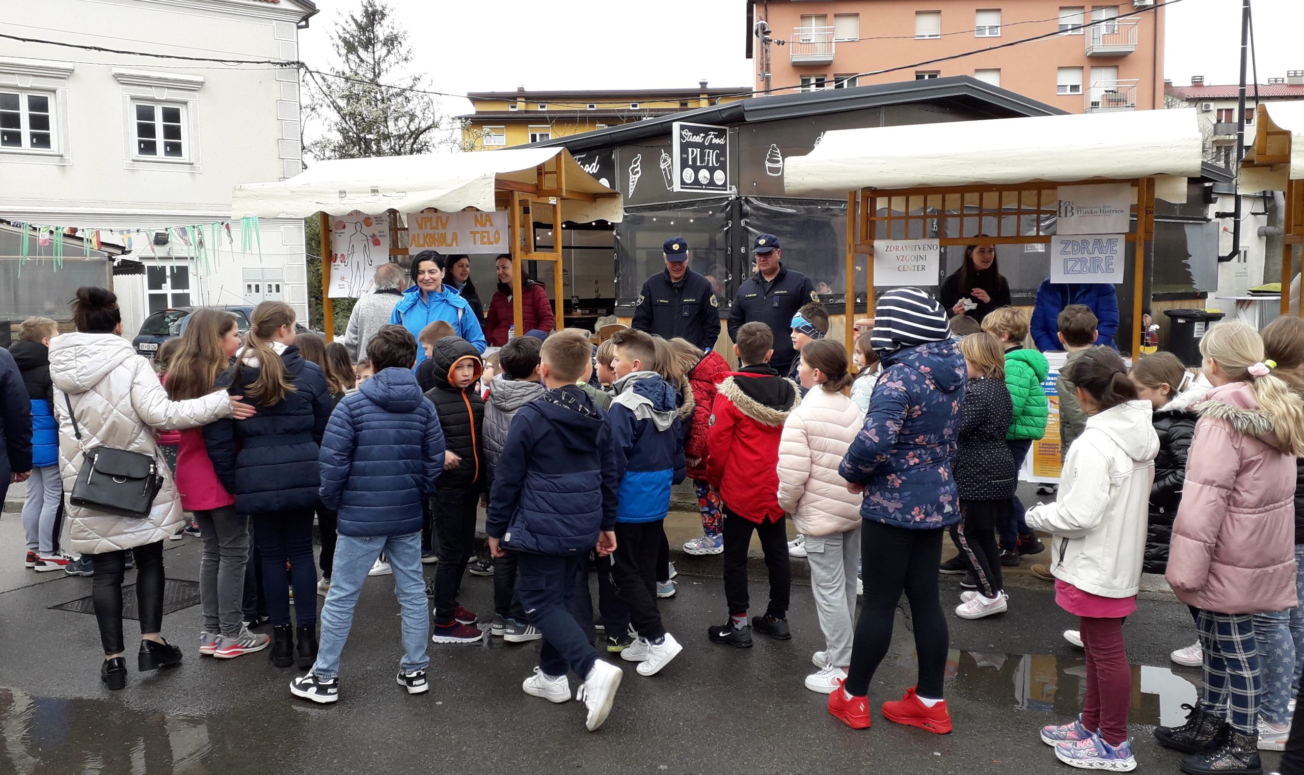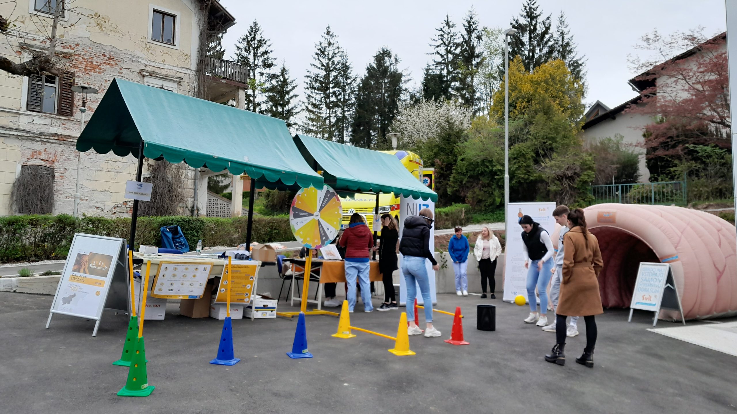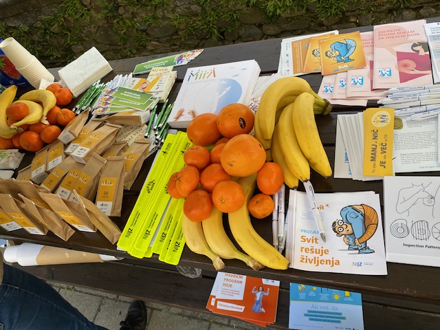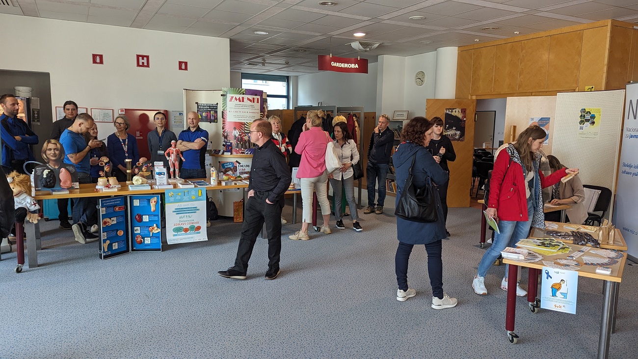 Na ploščadi pred prizidkom smo na stojnicah promovirali zdrav življenjski slog, delavnice v zdravstveno-vzgojnem centru in prednosti življenja brez alkohola. Mimoidoči so se lahko ob kolesu zdravja preizkusili v poznavanju dejstev glede pitja alkohola, lahko so se sprehodili po poligonu za uporabo očal za simulacijo opitosti in se seznanili s presejalnimi programi za raka: Zora, Dora in Svit. Na dogodku smo imeli tudi napihljiv model debelega črevesa, kjer smo mimoidočim predstavljali vzročno povezavo med pitjem alkohola in pojavnostjo raka. Sodelavci zdravstvenega doma so izvajali meritve krvnega sladkorja, krvnega tlaka, delavnice temeljnih postopkov oživljanja, promocijo zdrave prehrane, preventivo na področju energijskih pijač. Stojnice so z zanimivimi in zdravimi kulinaričnimi biseri dopolnila lokalna društva in srednja šola. Uvod v srečanje pa so s skupno vadbo popestrili člani Šole zdravja Gorje in tako ogreli od relativno hladnega jutra prezebla telesa.