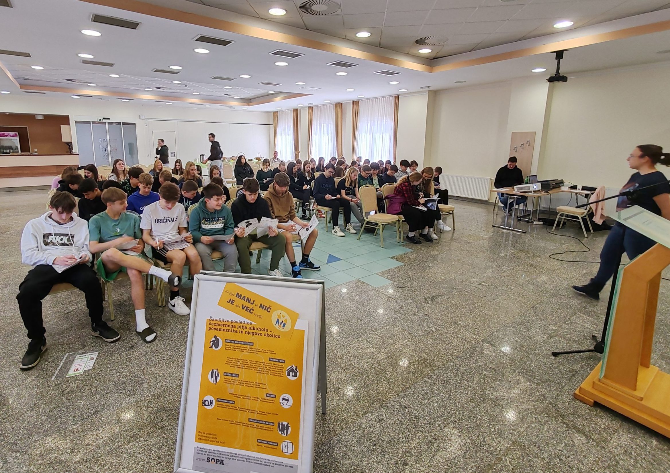 Po delavnici za učence smo za splošno in strokovno javnost v dvorani radeljskega hostla pripravili predavanja o zdravem življenjskem slogu z nič ali manj alkohola, kjer smo zbranim občanom in občankam predstavili tveganja, ki jih pitje alkohola predstavlja za naše zdravje, še posebej pa za posamezne ranljive skupine prebivalstva (otroci in mladostniki, nosečnice in doječe mamice, prejemniki zdravil, osebe s kroničnimi boleznimi ali težavami v duševnem zdravju,…). Spregovorili smo pogostih mitih, ki trdovratno spremljajo alkohol in ki pomagajo pri vzdrževanju te, že omenjene, mokre kulture. Za konec smo si skupaj pogledali, kako lahko preživljamo svoj čas na bolj izpolnjujoče in zdrave načine, z manj ali nič alkohola in kakšne izboljšave oz. prednosti nam to prinese.