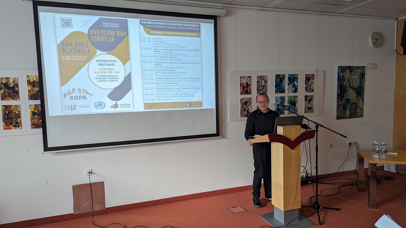 V četrtek, 4.aprila 2024, smo v Pokrajinski in študijski knjižnici v Murski Soboti obeležili Dan brez alkohola in Svetovni dan zdravja. Dogodek je bil v osnovi namenjen strokovni javnosti, je pa bila na ta dan v Knjižnico vabljena tudi vsa splošna javnost, saj so bili ob vstopu v knjižnico v dopoldanskem času, torej v času trajanja strokovnega srečanja, za informacije na voljo strokovnjaki NIJZ OE Murska Sobota in CKZ Murska Sobota, ki so predstavljali promocijska gradiva in aktivnosti, ki se odvijajo v njihovih ustanovah in naslavljajo različna področja krepitve zdravja in promocije zdravega življenjskega sloga za vse generacije.